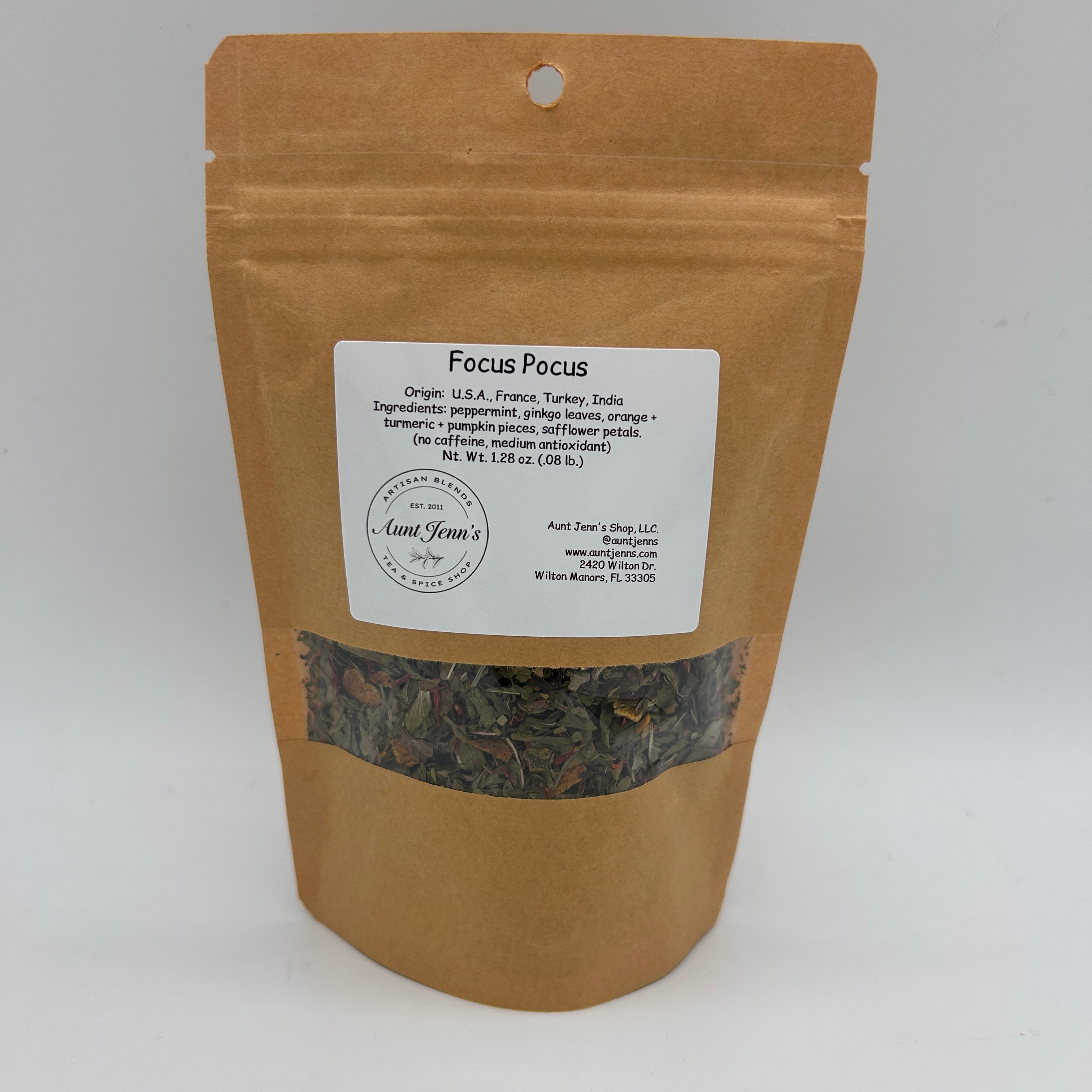 Ingredients: peppermint, ginkgo leaves, orange+turmeric+pumpkin spices, safflower petals. (no caffeine, medium antioxidant)