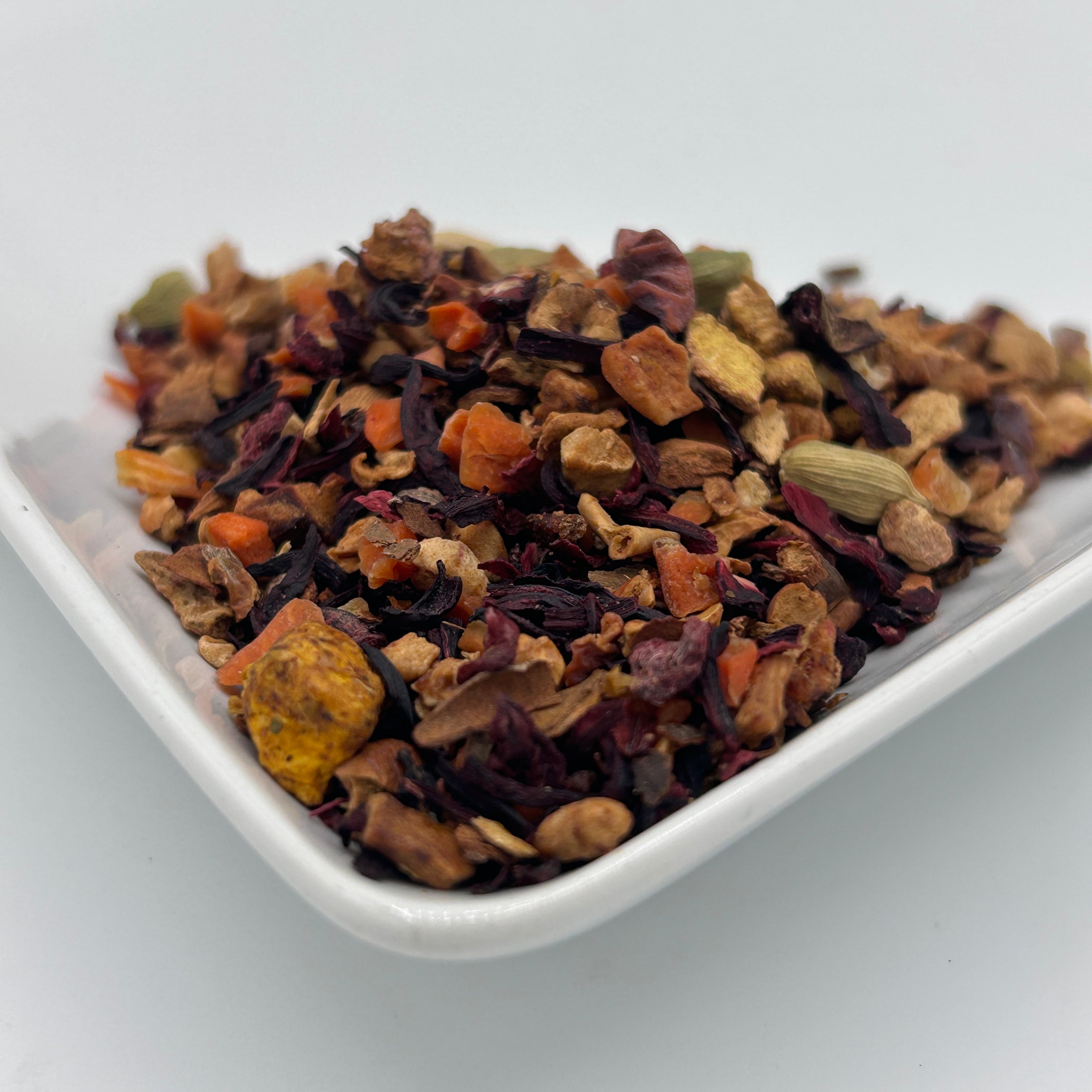 Ingredients: Apple+carrot+beet pieces, hibiscus, cinnamon, pomegranate peel, sea buckthorn,