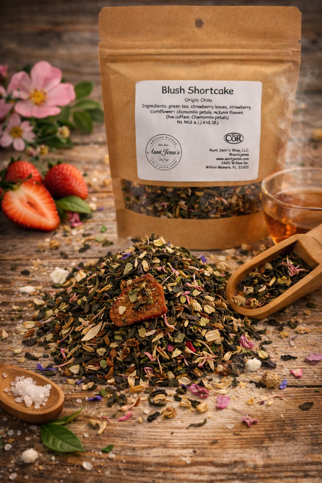 Description: Blush Shortcake is a delicate, fruity green tea blend bursting with sweet strawberry notes and soft floral hints. Smooth, lightly sweet, and refreshing, it delivers a dessert-like experience in every sip — bright, comforting, and effortlessly indulgent.