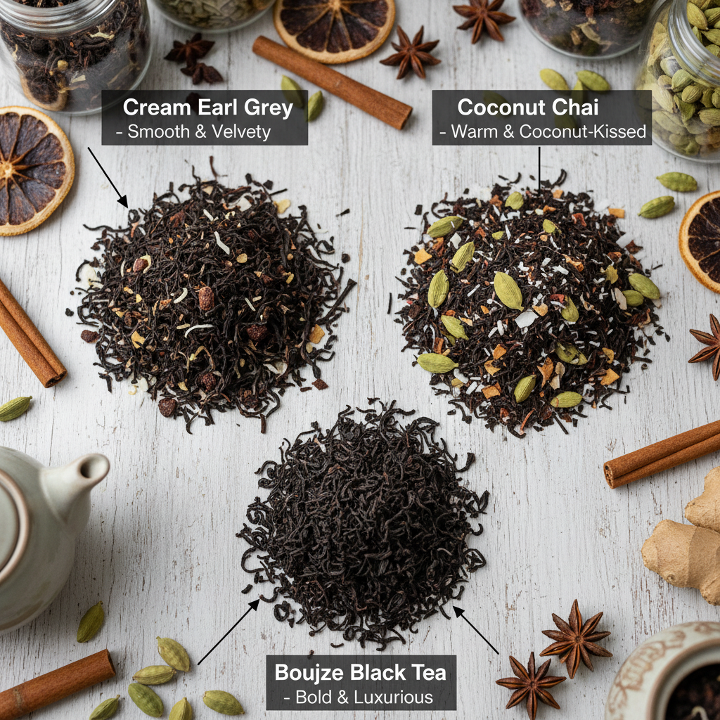 Warm, spiced chai blended with creamy coconut for a tropical‑spiced infusion. Comforting, aromatic, and gently sweet with an exotic twist.