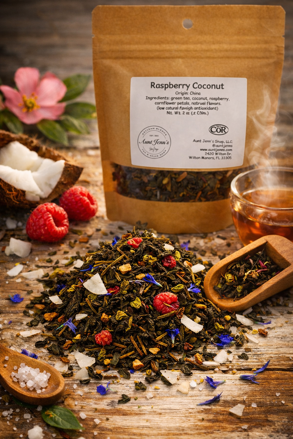 Ingredients: green tea, coconut, raspberry, cornflower petals, natural flavors.